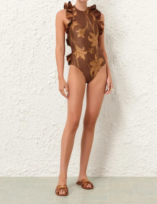 The Acadian Racer Back Frill 1Pc In Mustard/Chocolate Floral From Our Resort Swim 2024 Collection. A Lycra One Piece Featuring Bonded Frills Throughout And A Racer Back.- Lycra One Piece