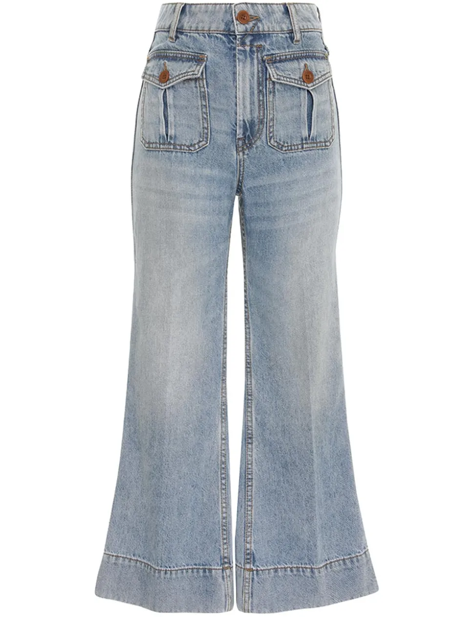 The Alight Cropped Flare Jean In Faded Blue From Our Resort Swim 2024 Collection. A Denim Cropped Flare Featuring A Wide Hem, Front And Back Pockets And Belt Loops.- Denim Crop Flare