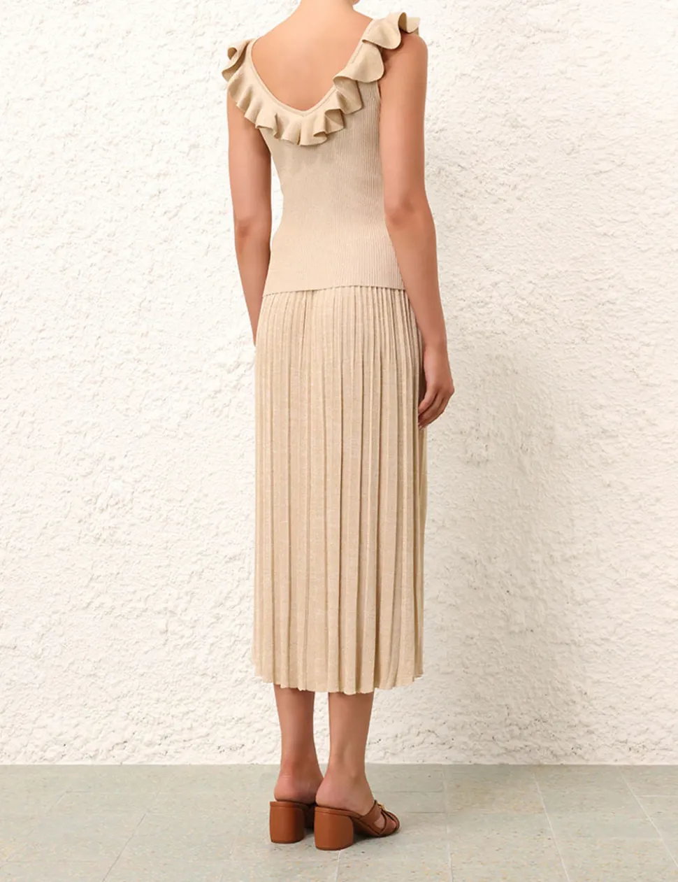 The Alight Frill V-Neck Top In Cream Lurex From Our Resort Swim 2024 Collection. A Ribbed Knit, Fitted Tank With A Frilled V-Neckline.- Fitted, Ribbed Tank