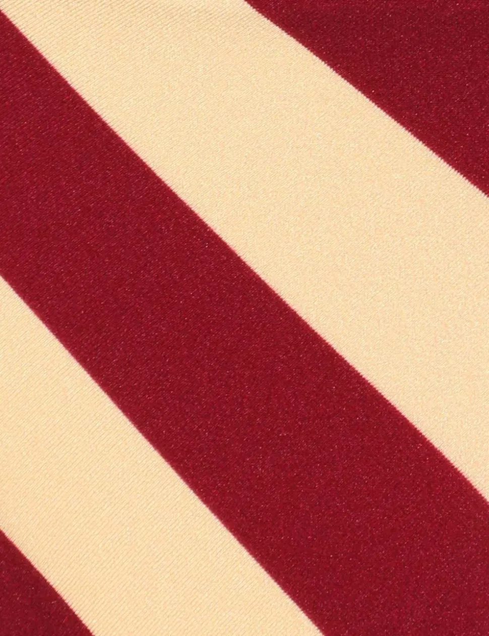 The Alight Rope Trim Mini Tri In Ruby/Cream Stripe From Our Resort Swim 2024 Collection. An Italian Lycra Bikini Set Featuring A Triangle Top And Low Cut Pant With Self Tie Rope Straps.- Italian Lycra