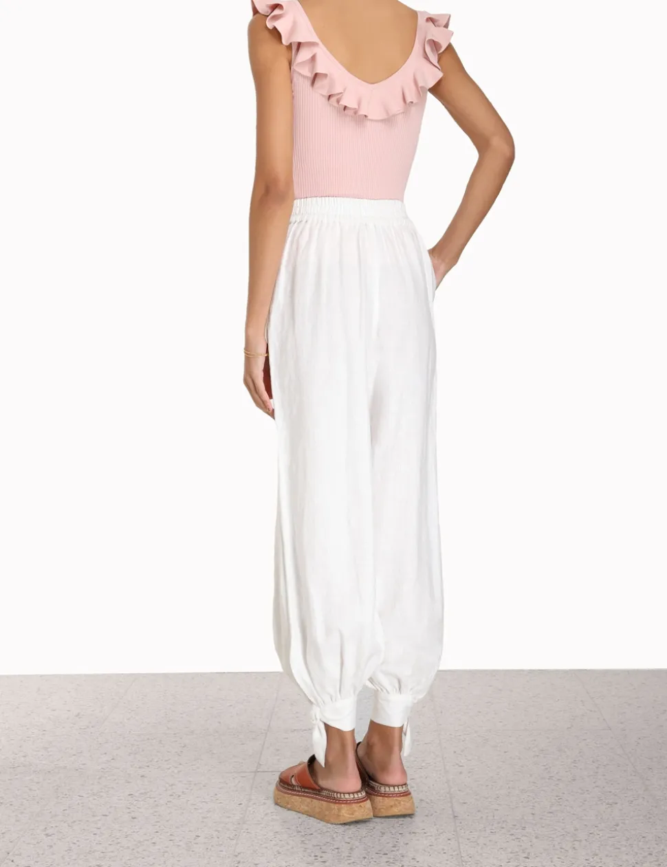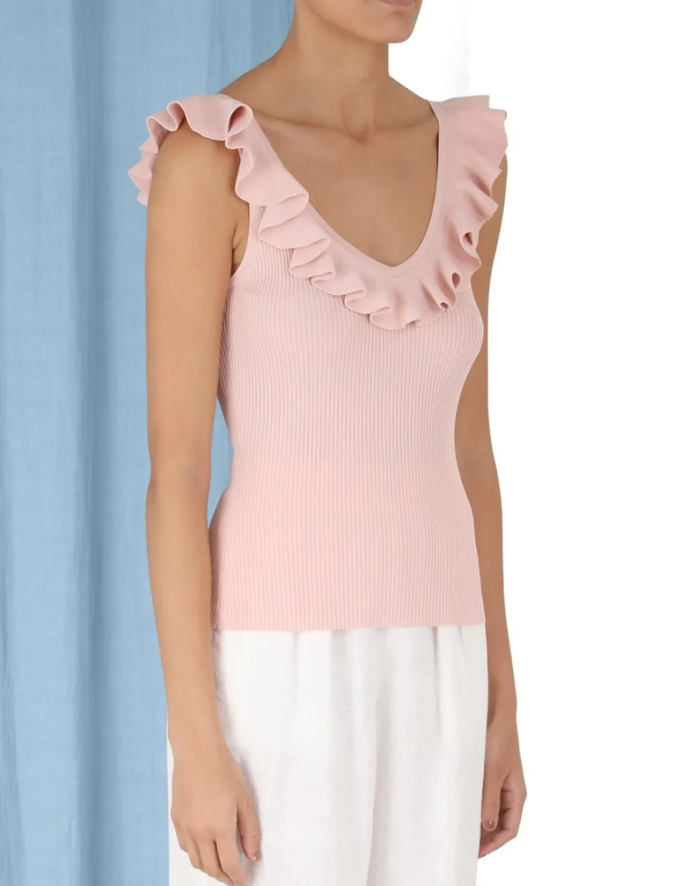 The Chintz V-Neck Frill Tank In Dusty Pink From Our Summer Swim 2023 Collection. A Ribbed Knit, Fitted Tank With A Frilled Scoop Neckline.- Fitted, Ribbed Tank
