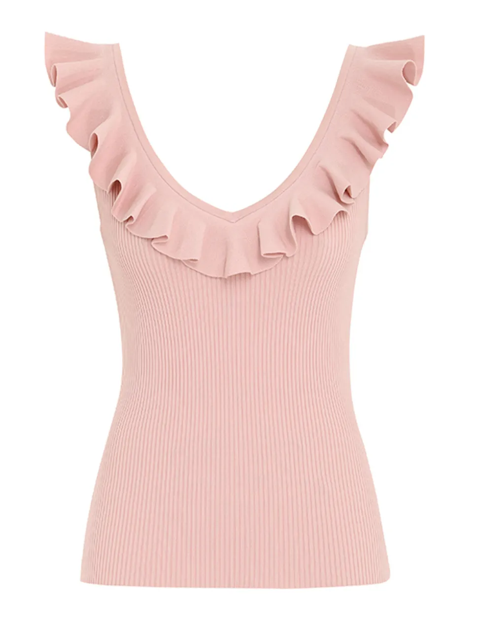 The Chintz V-Neck Frill Tank In Dusty Pink From Our Summer Swim 2023 Collection. A Ribbed Knit, Fitted Tank With A Frilled Scoop Neckline.- Fitted, Ribbed Tank