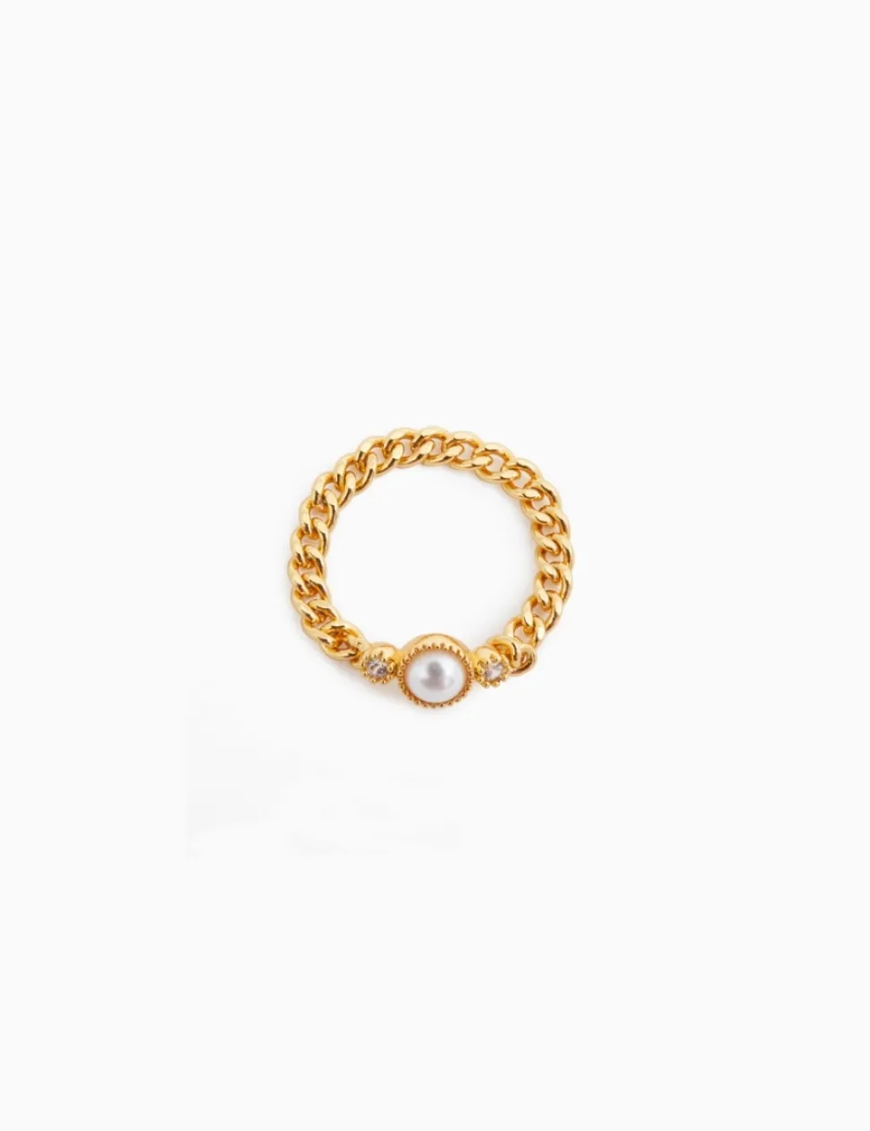 The Collage Fine Chain Ring In Gold From Our Spring 2023 Collection, Wonderland. A Gold Plated Fine Chain Ring Featuring A Pearl And Cubic Zirconia Stones.- 20K Gold Plated