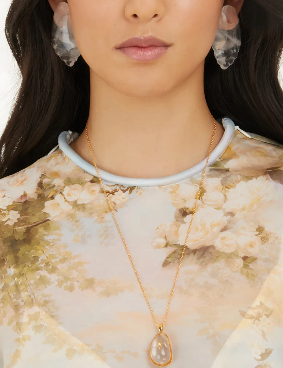The Crystal Carved Pebble Earrings In Crystal From Our Fall 2023 Collection, Luminosity. A Gold Pleated Earring Featuring Transparent Quartz Stone.- 20Kt Gold Plated