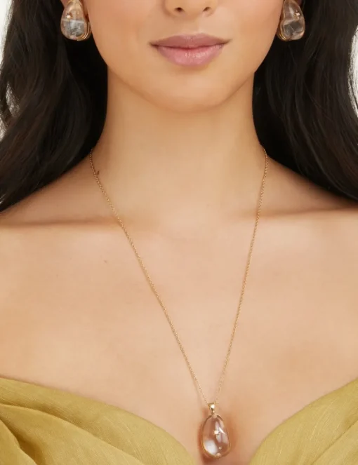 The Crystal Pebble Earrings In Gold/Transparent Quartz From Our Fall 2023 Collection, Luminosity. A Gold Plated Earring Featuring Transparent Quartz And A Single Cubic Zirconia Stone.- 20Kt Gold Plated Brass