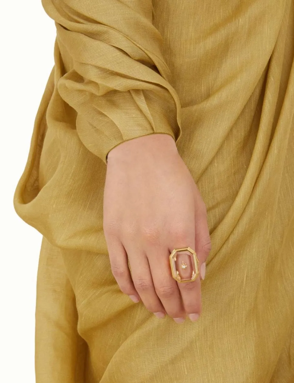 The Crystal Signet Ring In Gold/Transparent Quartz From Our Fall 2023 Collection, Luminosity. A Gold Pleated Ring Featuring Transparent Quartz And A Cubic Zirconia Stone.- 20Kt Gold Plated Brass
