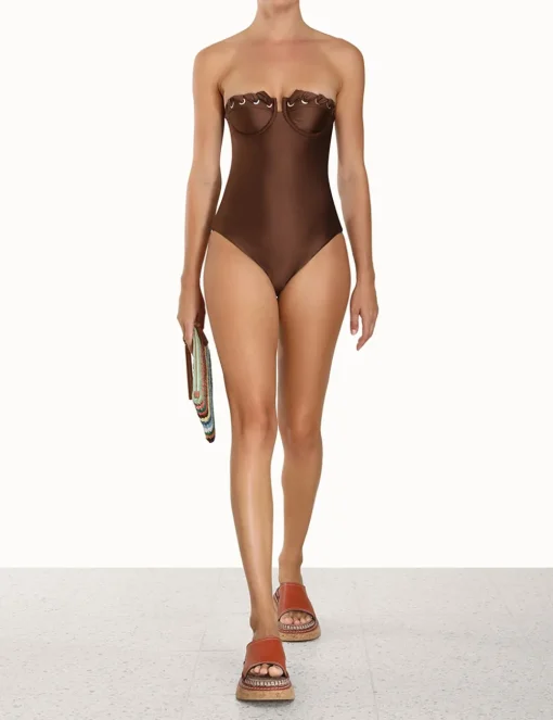 The Devi Eyelet Balconette 1Pc In Chocolate From Our Summer Swim 2023 Collection. A Shiny Lycra One Piece Featuring A Balconette Bust With Foam Cups And Eyelets, Removable Straps, Boning At The Side Seams And Underwire.- Shiny Lycra One Piece