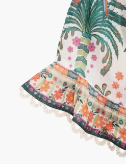 The Ginger Flip Skirt In Cream Tropical From Our Summer Swim 2023 Collection. A Cotton Skirt With Playful Ruffle Hem And Drawstring Waist With Tassel Ends.- Cotton