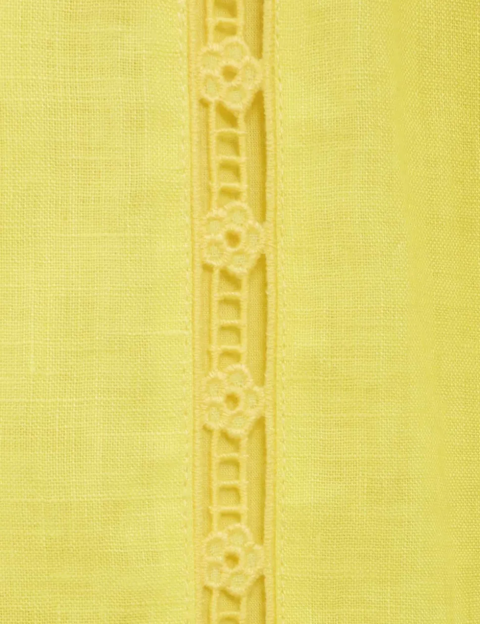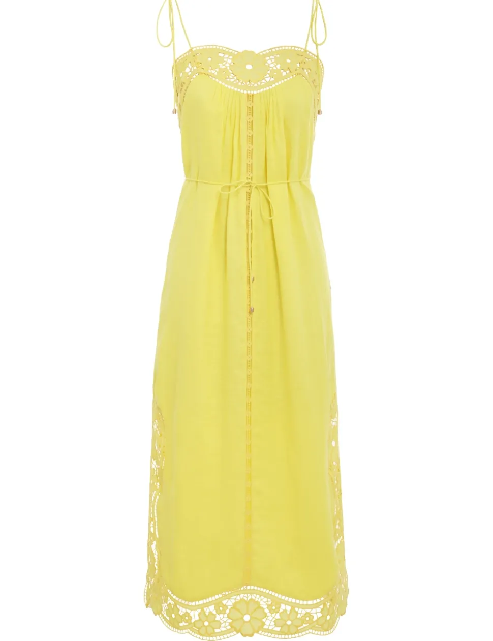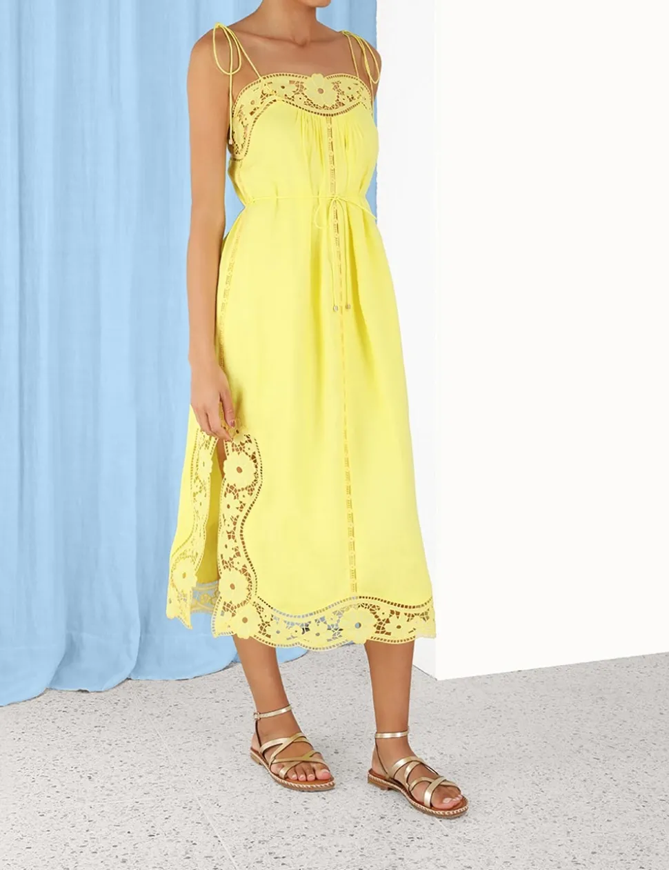 The Halcyon Broderie Slip Dress In Yellow From Our Summer Swim 2023 Collection. A Linen Slip Dress Featuring Self Tie Rouleau Straps And Panels Of Broderie Lace Throughout.- Linen Midi Dress