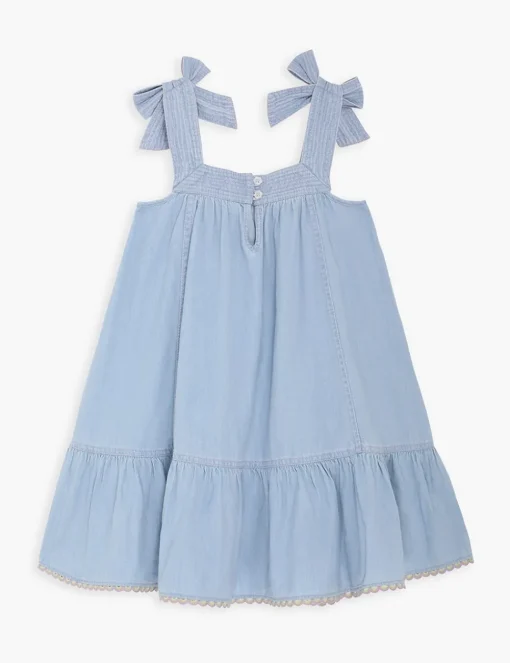 The Halcyon Denim Dress In Misty Blue From Our Summer Swim 2023 Collection. A Denim Dress Featuring Self Tie Shoulders And Drop Frill Hem, Finished With An Embroidered Zimmermann Motif.- Cotton Denim Dress