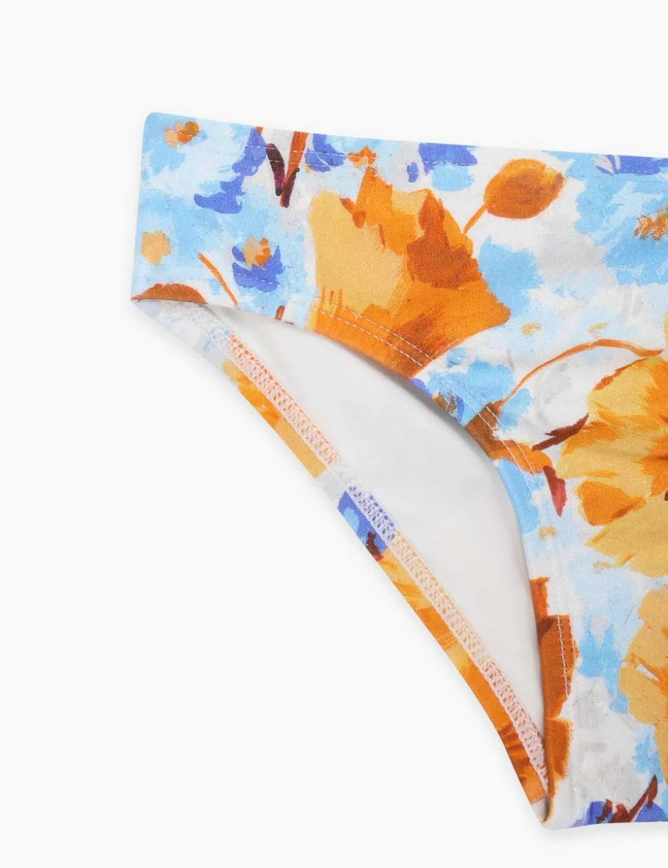 The Halcyon Gathered Strap Bikini In Orange/Blue Floralfrom Our Summer Swim 2023 Collection. A Lycra Bikini Set Featuring Elasticated Straps And A Placement Print Throughout.- Lycra Bikini Set