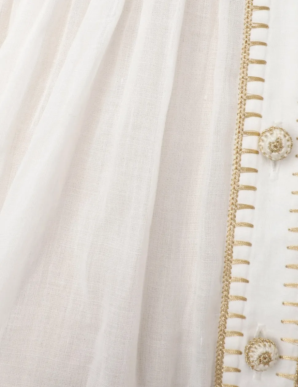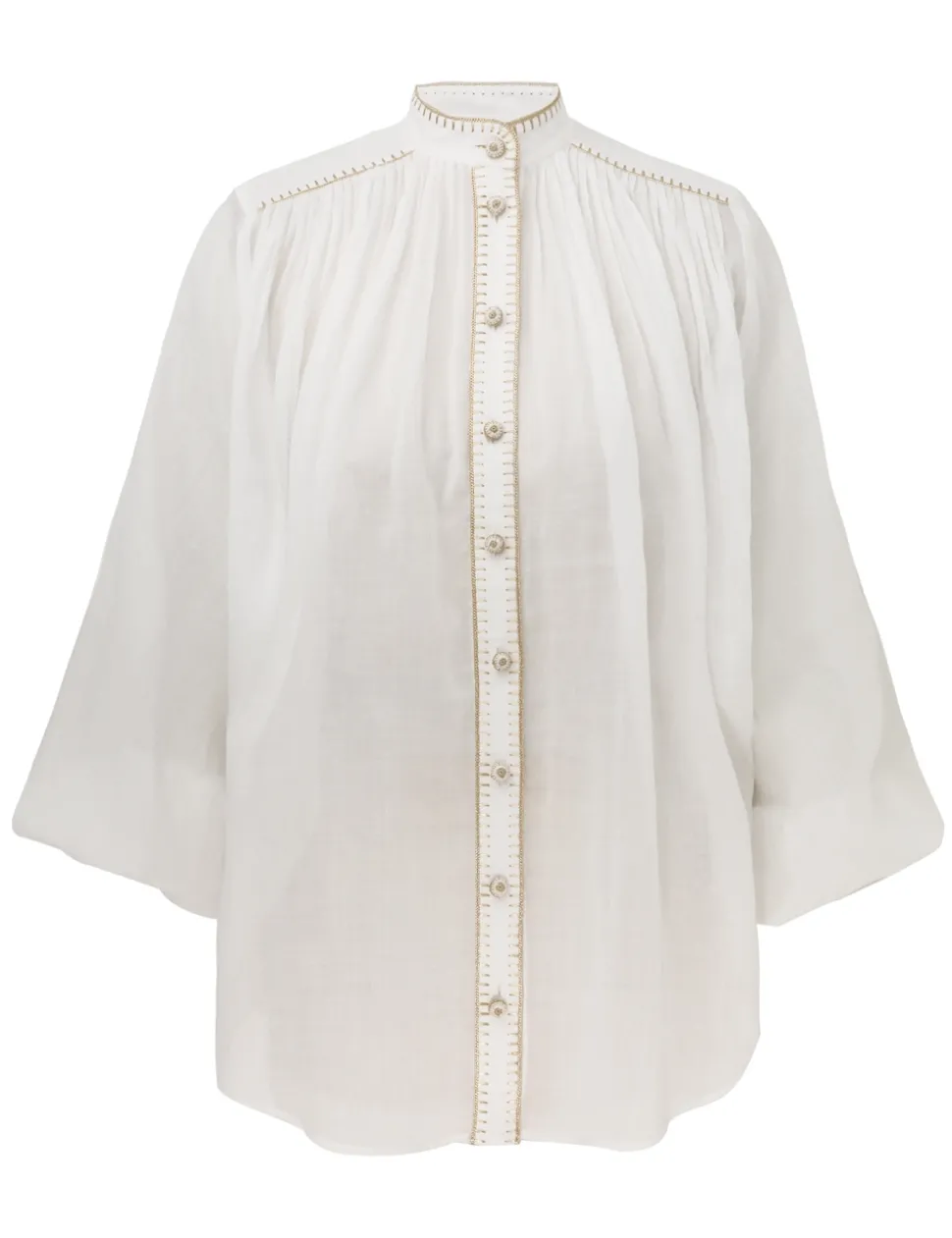 The Junie Billow Blouse In Ivory From Our Resort Swim 2024 Collection. A Long Sleeve Blouse Featuring Buttons Down The Centre Front, Gold Lurex Crochet Edging And Pleats Along The Neckline.- Long Sleeve Ramie Blouse