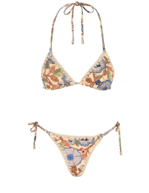 The Junie Crochet Edge Bikini In Ivory/Blue Floralfrom Our Resort Swim 2024 Collection. An Italian Lycra Bikini Set Featuring Crochet Edging And Self Tie Straps With Toggle Ends.- Italian Lycra