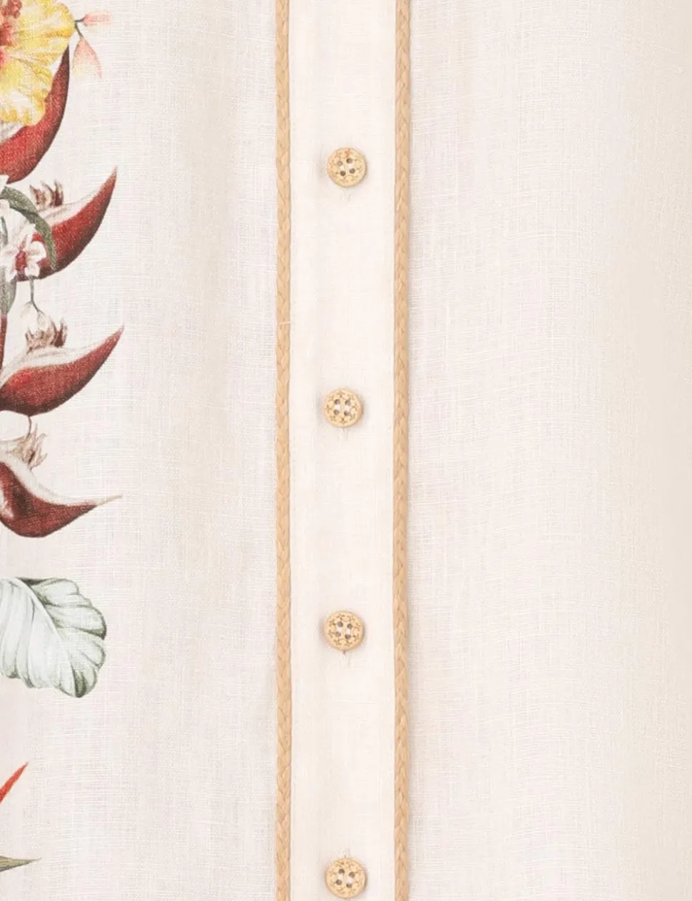 The Lexi Relaxed Shirt In Ivory Palm From Our Resort Swim 2024 Collection. A Placement Print Short Sleeve Shirt Featuring Raffia Fringing.- Short Sleeve Button Up Shirt