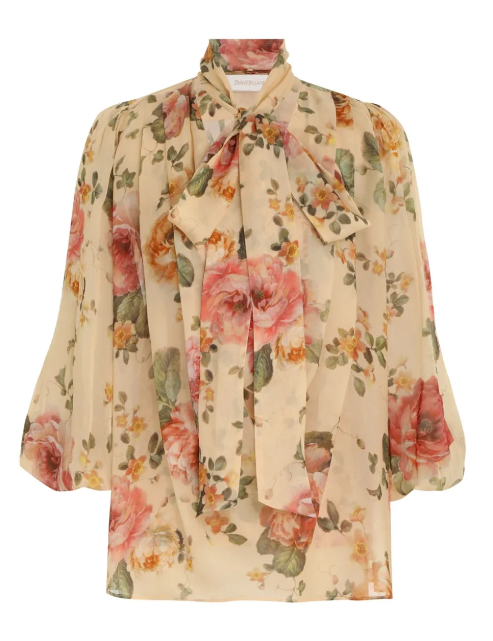 The Luminosity Billow Blouse In Latte Floral Print From Our Fall 2023 Collection, Luminosity. A Long Sleeve Blouse Featuring A Cowl Neck And A Self Tie Neck.- Long Sleeve Printed Blouse