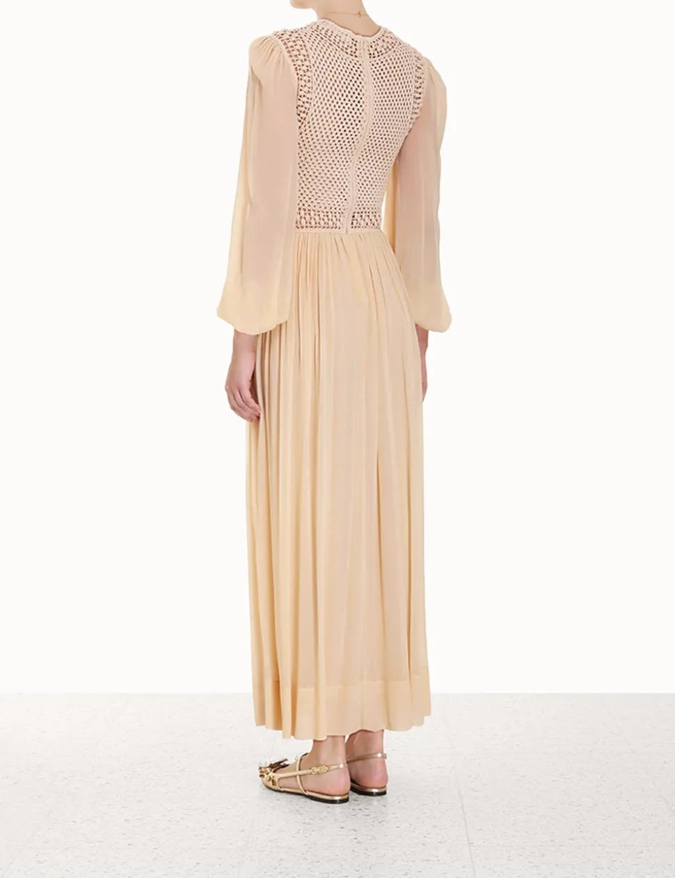 The Luminosity Crochet Bodice Midi In Cream From Our Fall 2023 Collection, Luminosity. A Long Sleeve Midi Dress Featuring A Crochet Bodice And Blouson Sleeves With Elasticated Sleeve Cuffs.- Long Sleeve Midi Dress