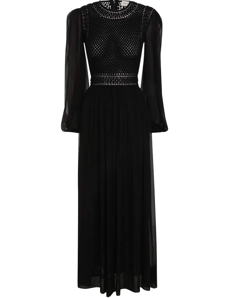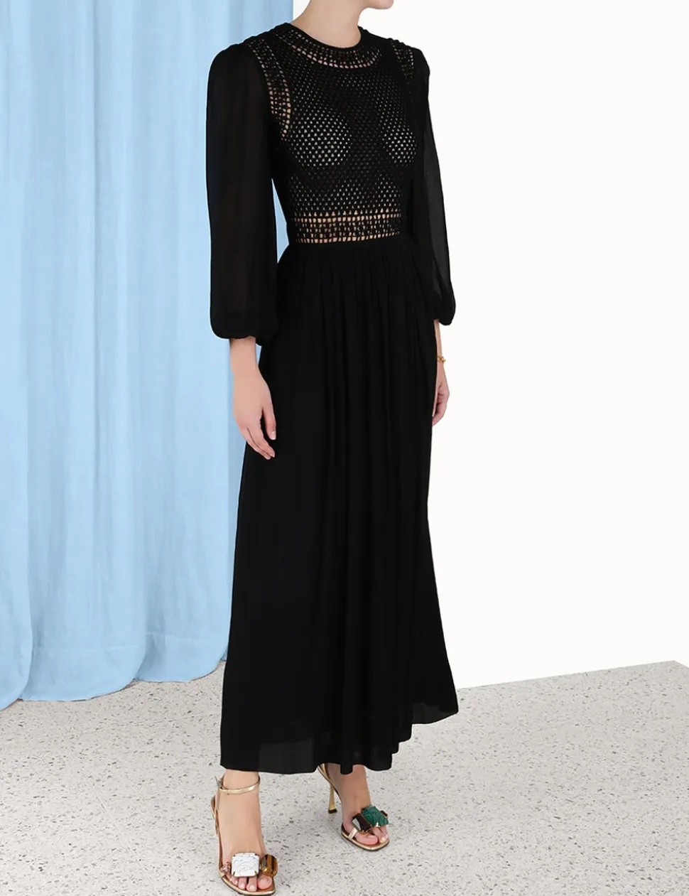 The Luminosity Crochet Bodice Midi In Black From Our Fall 2023 Collection, Luminosity. A Long Sleeve Midi Dress Featuring A Crochet Bodice And Blouson Sleeves With Elasticated Sleeve Cuffs.- Long Sleeve Midi Dress