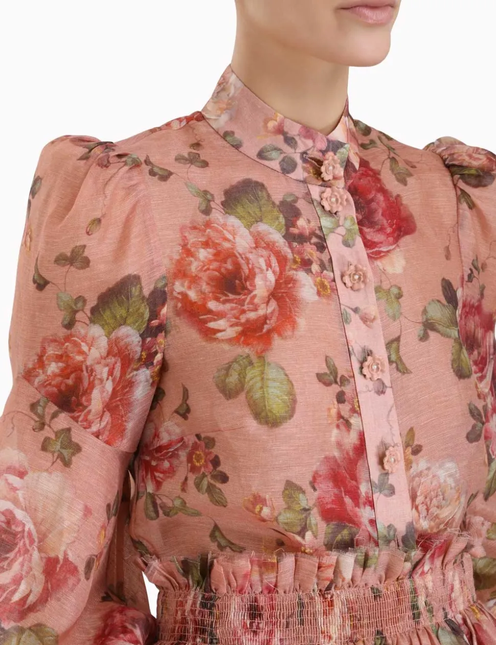 The Luminosity Floral Blouse In Dusty Pink Floral Print From Our Fall 2023 Collection, Luminosity. A Silk Linen Organza Blouse Featuring A Centre Front Placket With Buttons And A Blouson Sleeve.- Silk Linen Organza Blouse