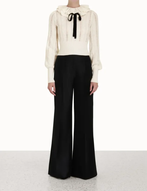 The Luminosity Frill Neck Sweater In Cream From Our Fall 2023 Collection, Luminosity. A Merino Wool Sweater Featuring A Ruffled Neck With Contrast Velvet Tie And Long Blouson Sleeves With Elongated Cuffs.- Mini Cable Stitch Knit