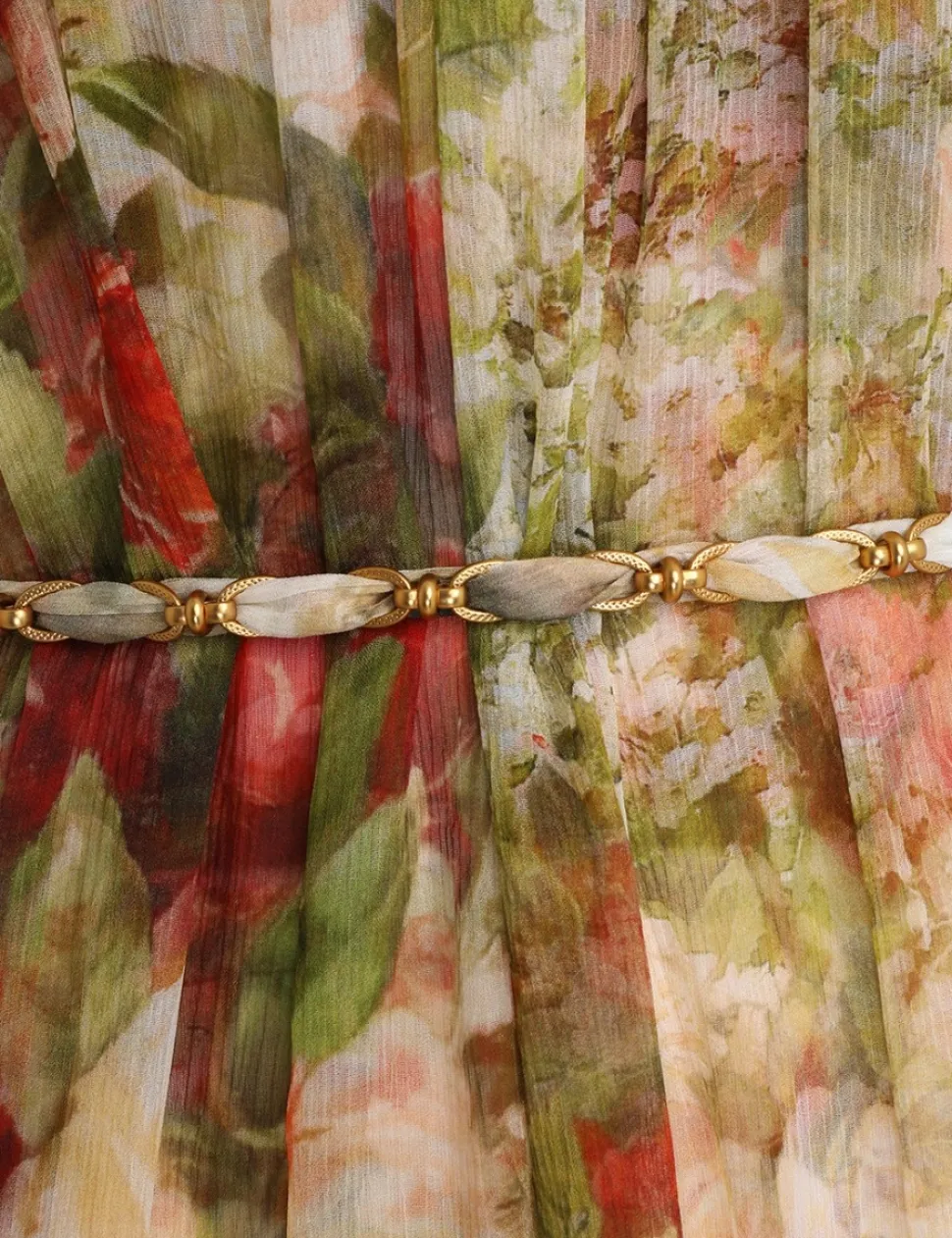 The Luminosity Frill Swing Mini In Multi Spliced Floral From Our Fall 2023 Collection, Luminosity. A Silk Georgette Mini Swing Dress Featuring Frills Throughout, Picot Edge Trims, And Raglan Sleeves With Elasticated Cuffs.- Silk Georgette Mini Dress