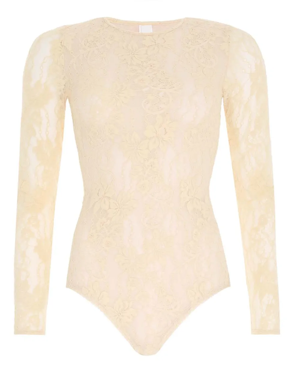 The Luminosity Lace Bodysuit In Parchment From Our Fall 2023 Collection, Luminosity. A Lace Bodysuit Featuring A Crew Neck And Long Sleeves.- Stretch Lace