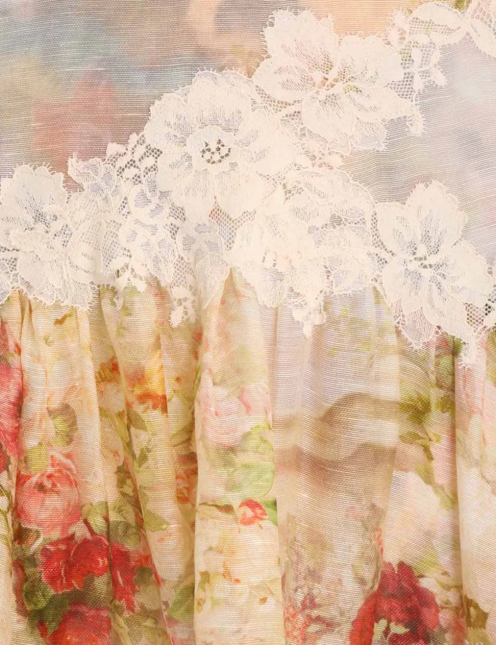 The Luminosity Splice Lace Skirt In Garden Scene From Our Fall 2023 Collection, Luminosity. A Silk Linen Skirt Featuring Spliced Panels Of Lace Throughout And Full, Asymmetric Hem.- Silk Linen Organza