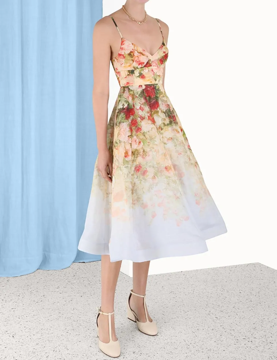 The Luminosity Picnic Dress In Rosy Garden Print From Our Fall 2023 Collection, Luminosity. A Silk Linen Midi Dress Featuring A Fitted Bustier, Shirred Back Bust And Adjustable Shoulder Straps.- Linen