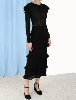 The Luminosity Ruffle Dress In Black From Our Fall 2023 Collection, Luminosity. A Knitted Midi Dress Featuring Ruffled Details Throughout.- Textured Knit