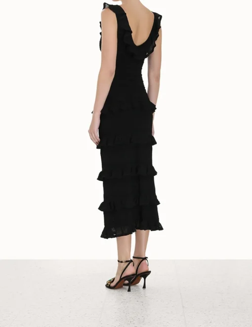 The Luminosity Ruffle Tank Dress In Black From Our Fall 2023 Collection, Luminosity. A Knitted Midi Dress Featuring Ruffled Details Throughout.- Textured Knit