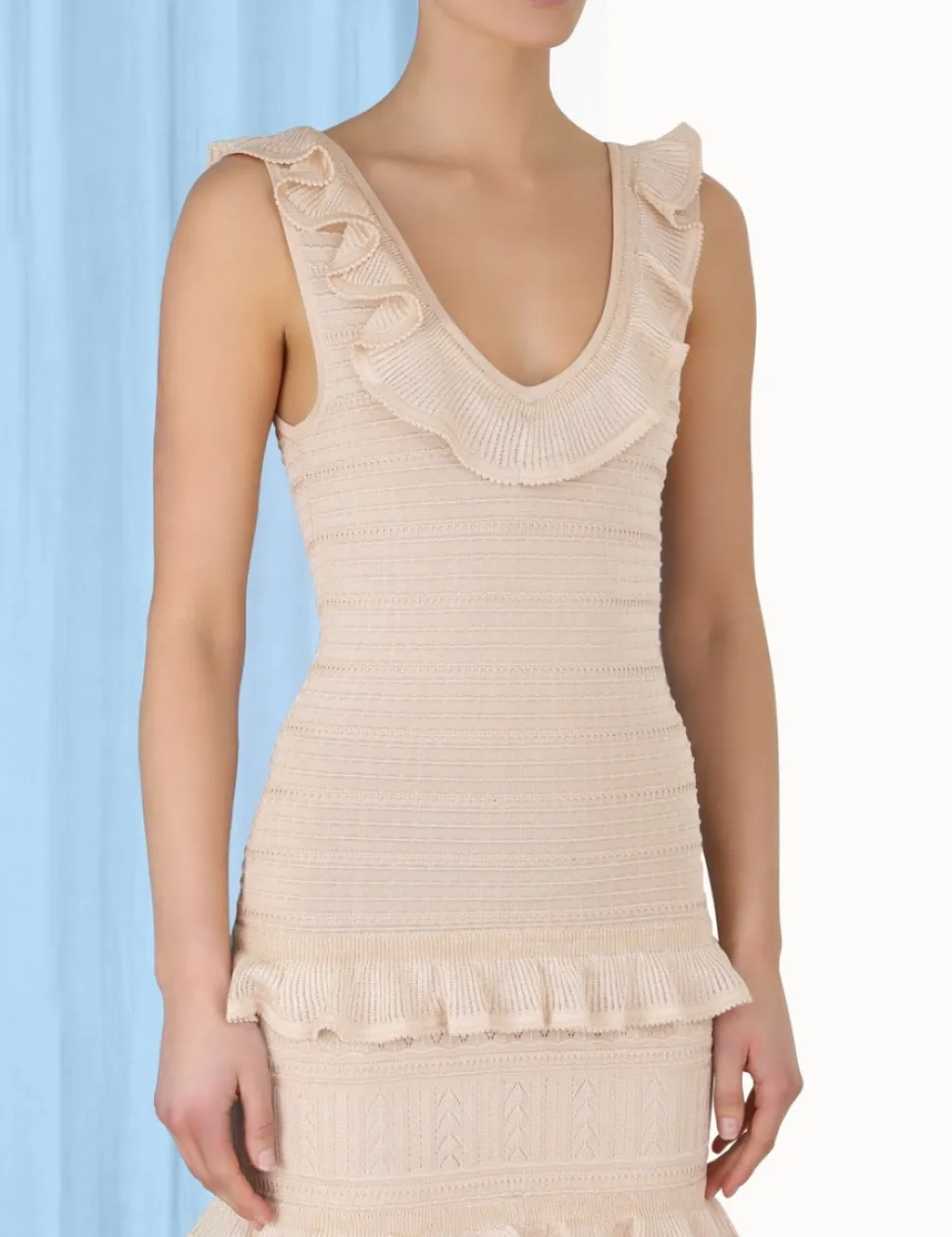The Luminosity Ruffle Tank Dress In Champagne From Our Fall 2023 Collection, Luminosity. A Knitted Midi Dress Featuring Ruffled Details Throughout.- Textured Knit