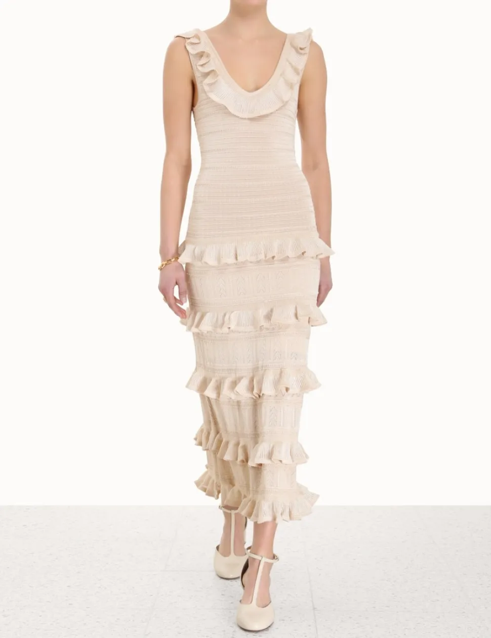 The Luminosity Ruffle Tank Dress In Champagne From Our Fall 2023 Collection, Luminosity. A Knitted Midi Dress Featuring Ruffled Details Throughout.- Textured Knit