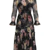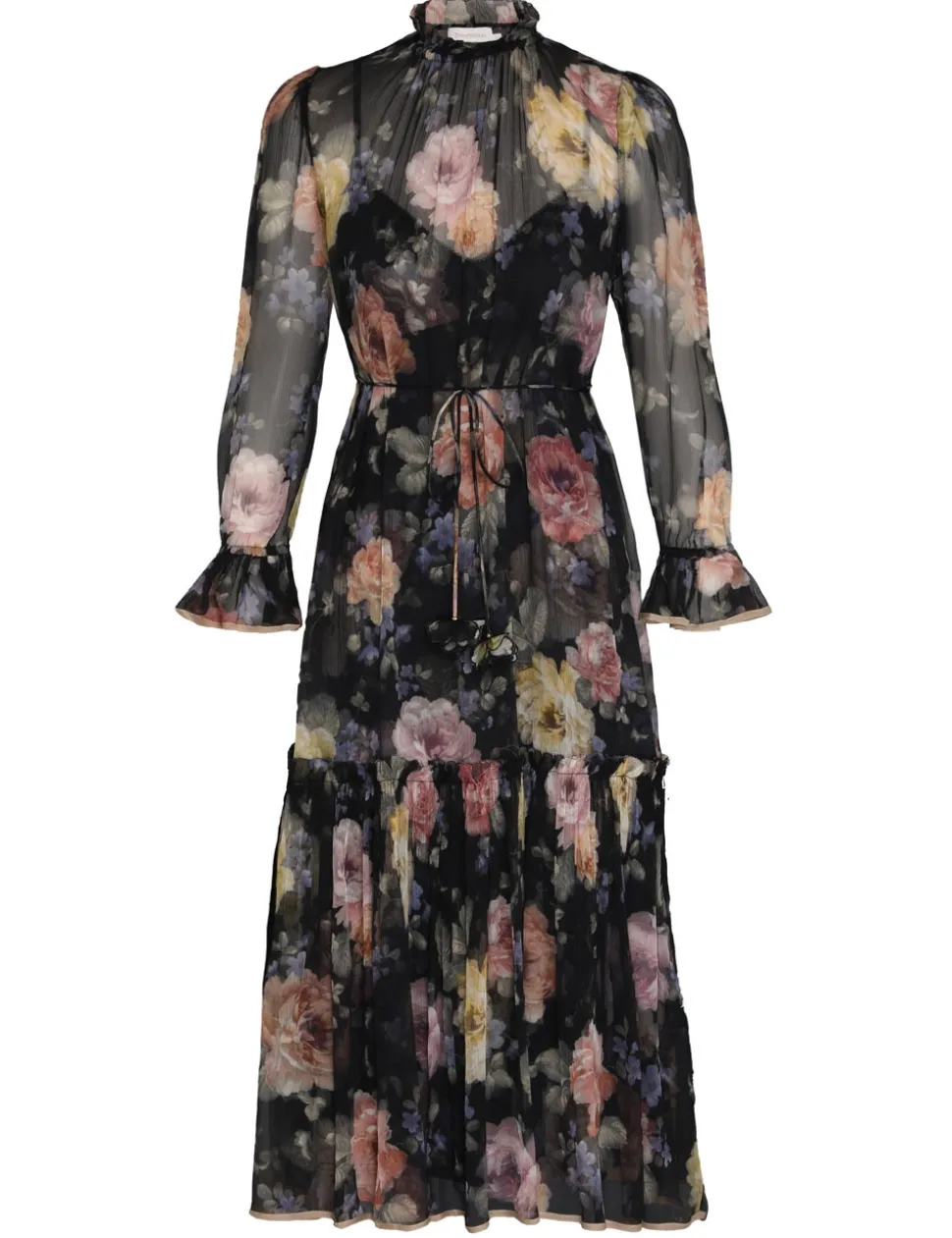 The Luminosity Tubular Midi Dress In Multi Floral Black From Our Fall 2023 Collection, Luminosity. A Silk Midi Dress Featuring Long Fluted Sleeves And Stand Collar, Finished With A Frilled Drop Hem.- Silk Midi Dress
