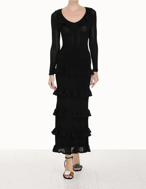 The Luminosity V-Neck Ruffle Top In Black From Our Fall 2023 Collection, Luminosity. A Knitted Long Sleeve Top Featuring A V Neckline And Ruffled Detailing Throughout.- Knitted Top