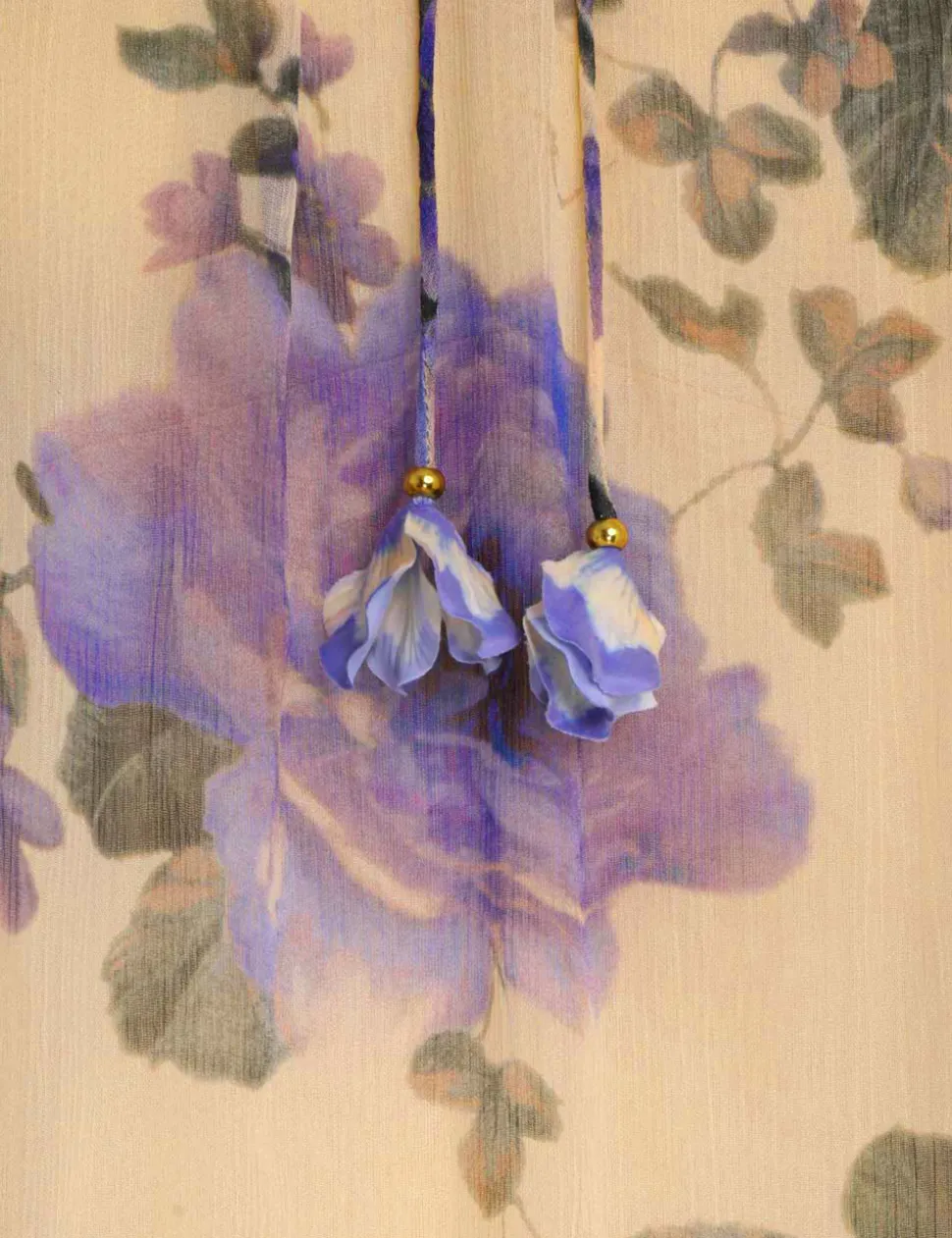 The Lyrical Billow Blouse In Blue Floral Print From Our Fall 2023 Collection, Luminosity. A Crinkle Georgette Blouse Featuring 3D Flower Appliques At The Collar And Neck Ties.- Relaxed Blouse