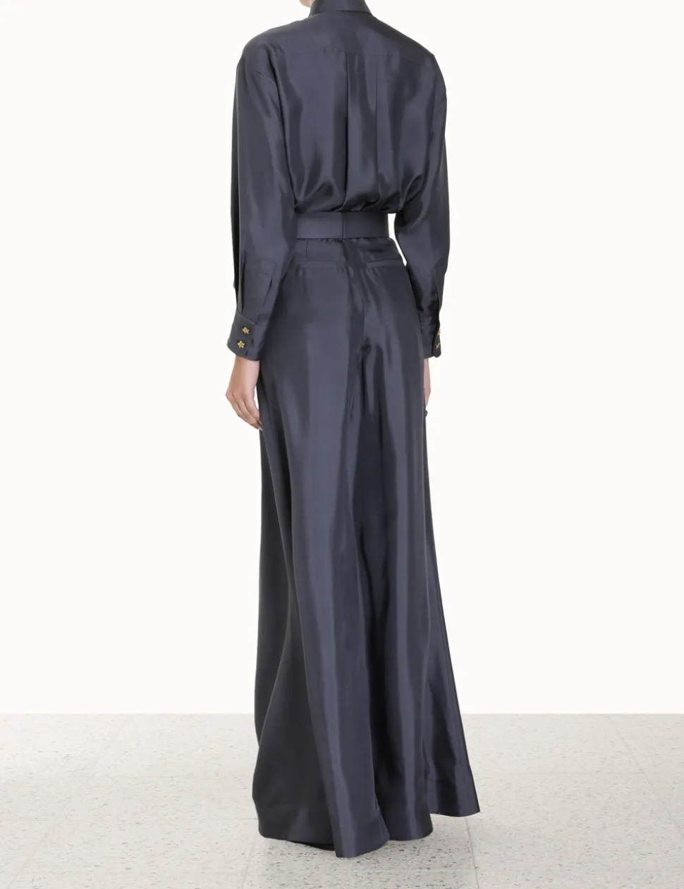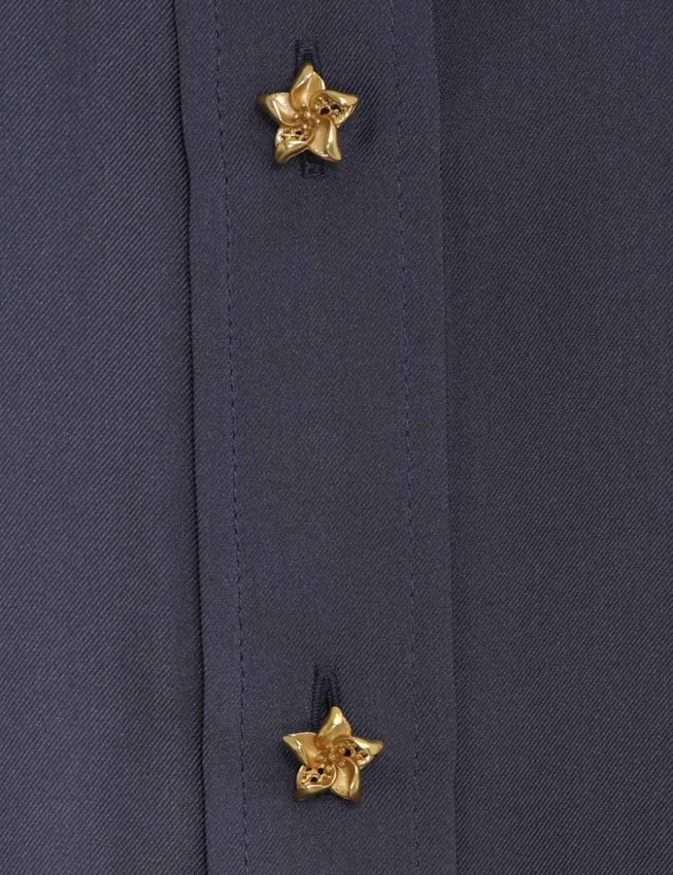 The Lyrical Relaxed Shirt In Paradise Navy From Our Fall 2023 Collection, Luminosity. A Relaxed Silk Twill Shirt Featuring Gold Floral Buttons Throughout.- Silk Twill