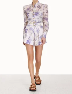 The Lyrical Tuck Shorts In Blue Iris Cream From Our Fall 2023 Collection, Luminosity. A High Waisted Linen Short Featuring Side Seam Pockets And A Self Cover Buckle Belt.- Linen
