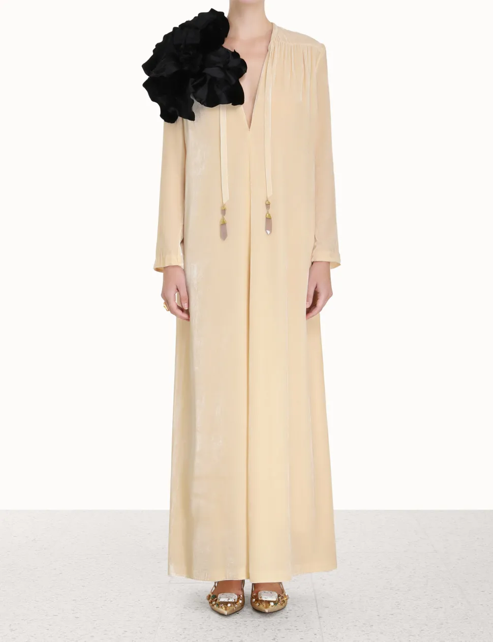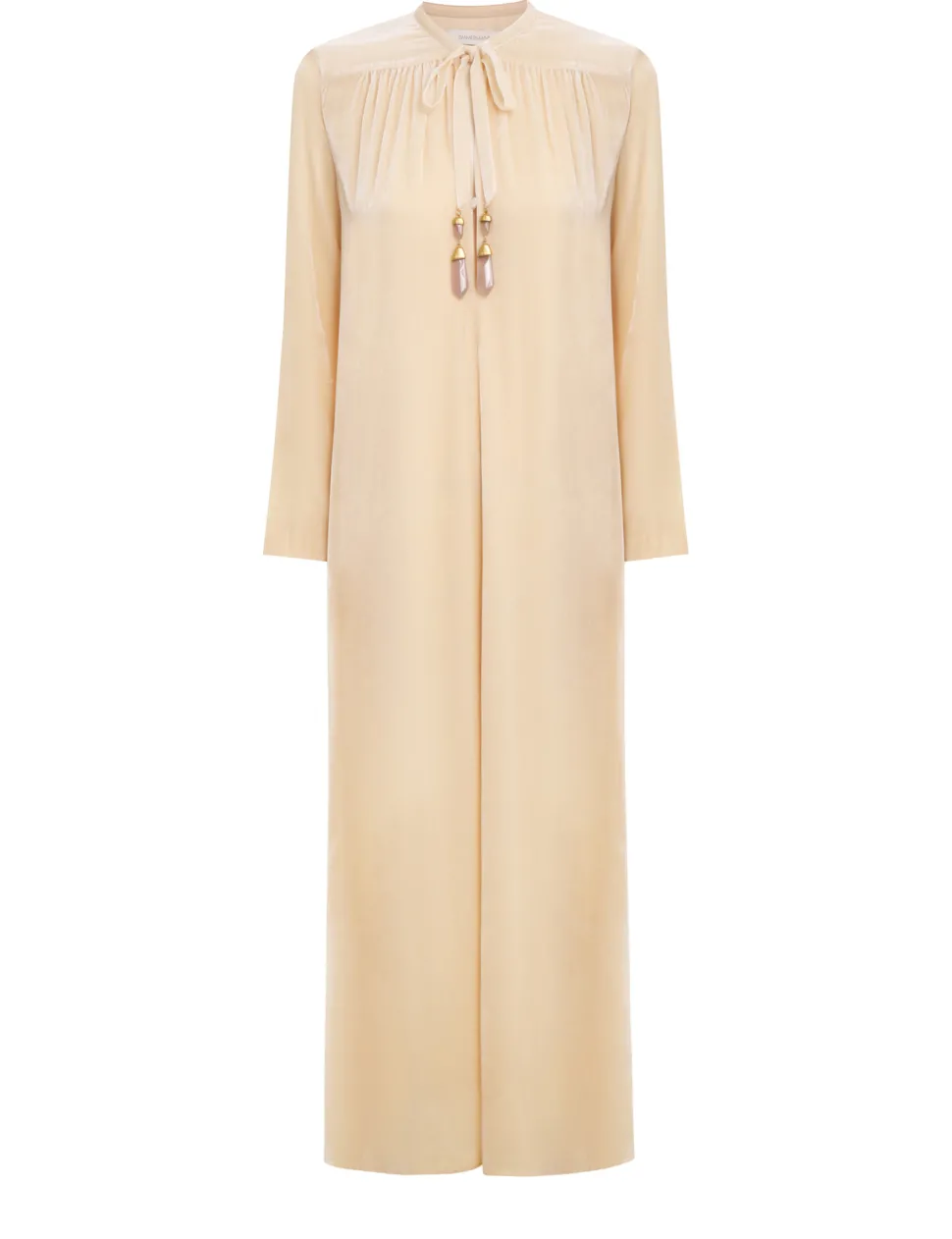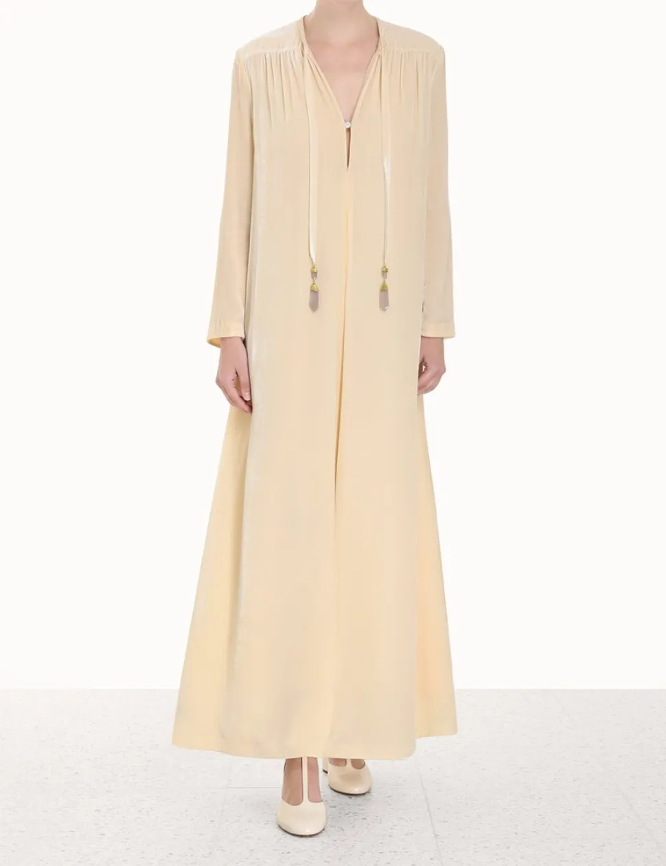 The Lyrical Velvet Tubular Dress In Macadamia From Our Fall 2023 Collection, Luminosity. A Velvet Long Sleeve Dress Featuring Gathering At The Shoulder Yoke And A Wide Bias Hem.- Velvet Long Sleeve Dress