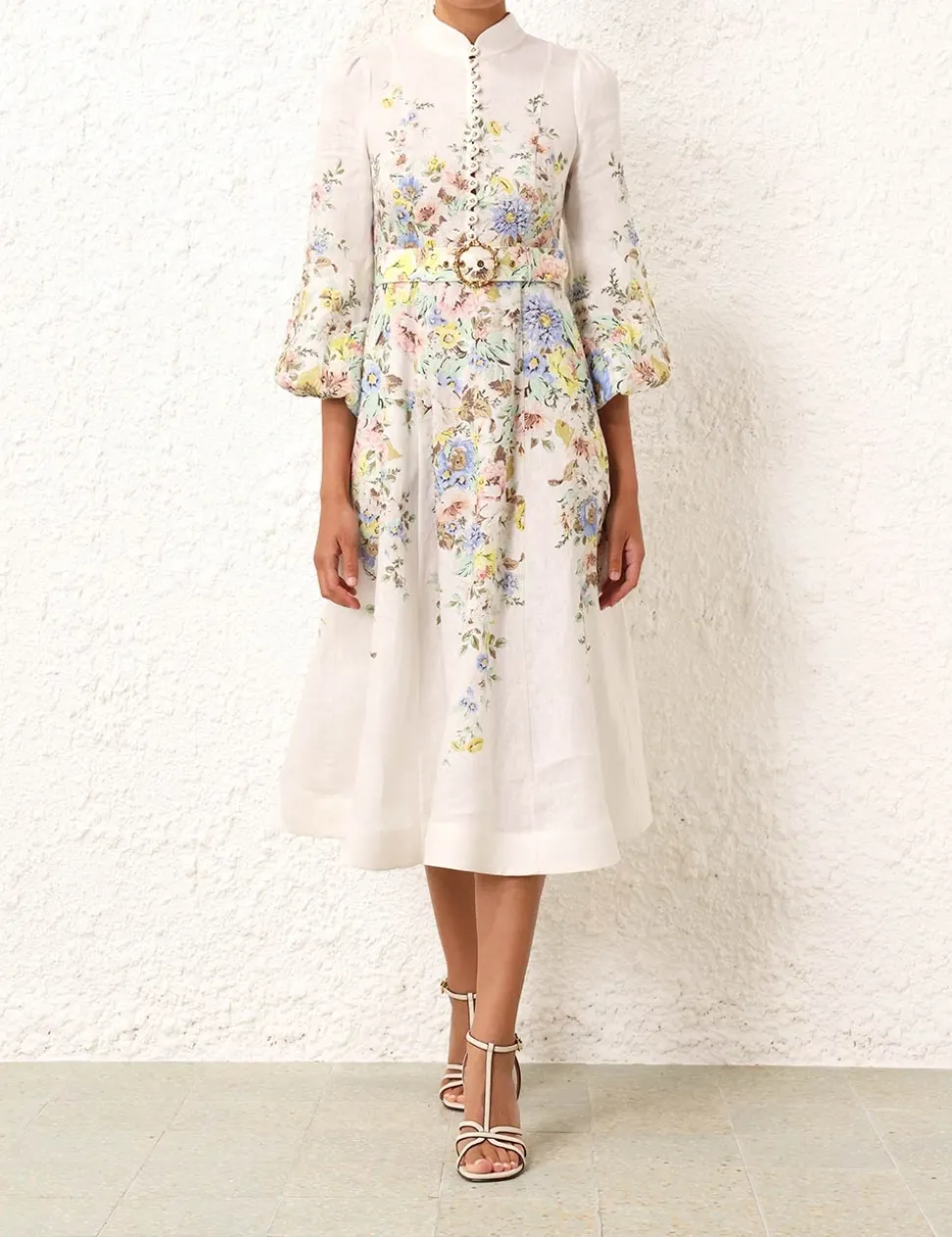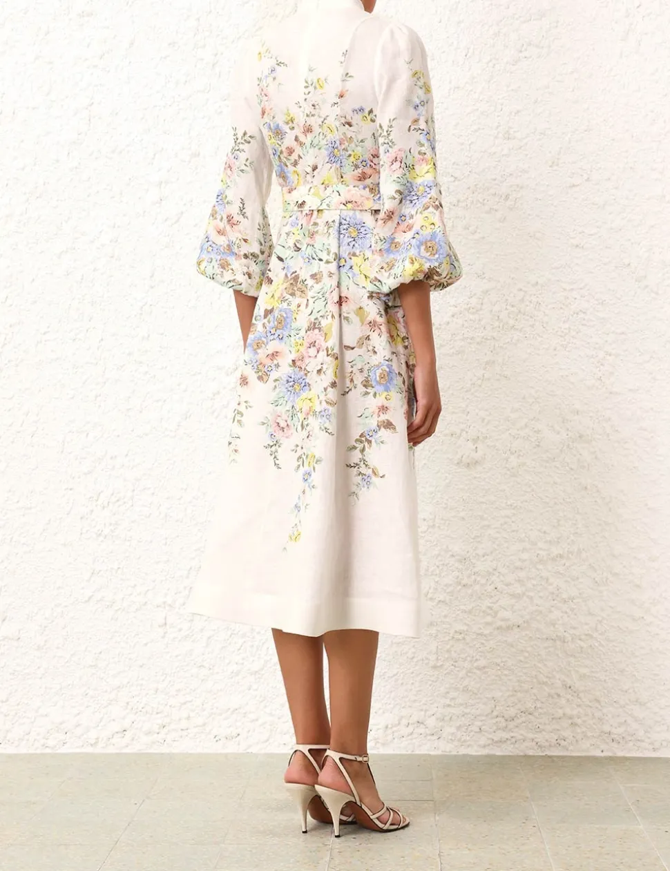 The Matchmaker Buttoned Midi Dress In Cream/Blue Floral From Our Resort 2024 Collection, Matchmaker. A Linen Midi Dress Featuring A Stand Collar And Exaggerated Sleeves.- Linen Midi Dress