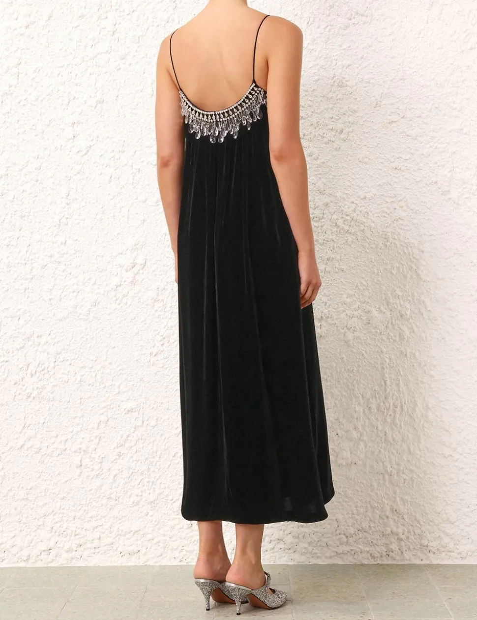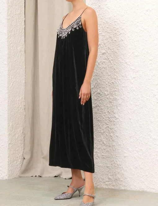 The Matchmaker Diamante Slip Dress In Black From Our Resort 2024 Collection, Matchmaker. A Velvet Slip Dress Featuring Rouleau Straps And A Diamante Crystal Trim Along The Neckline.- Velvet Slip Dress
