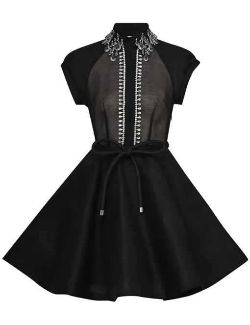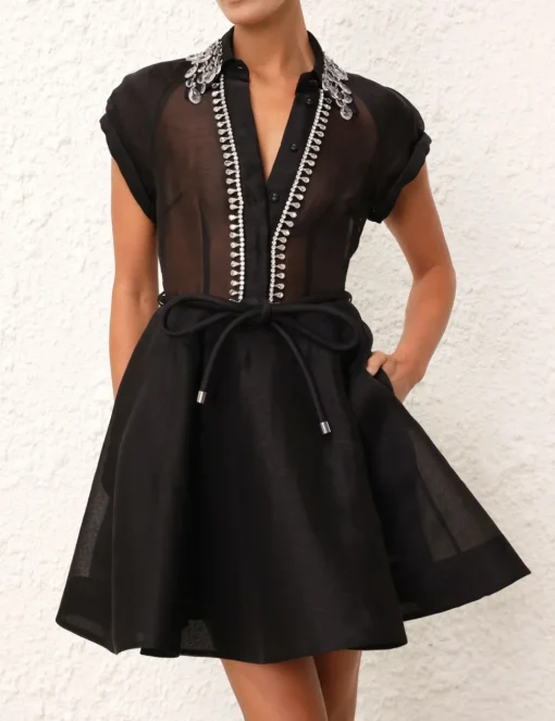 The Matchmaker Flip Dress In Black From Our Resort 2024 Collection, Matchmaker. A Silk Linen Organza Mini Dress Featuring A Shirt Shaped Bodice And Full Mini Skirt, Finished With Crystal Trims Throughout.- Silk Linen Mini Dress