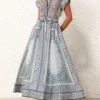 The Matchmaker Gathered Midi Skirt In Blue Bandana From Our Resort 2024 Collection, Matchmaker. A Silk Linen Organza Midi Skirt Featuring A Tulle Petticoat And Placement Print Throughout.- Silk Linen Organza