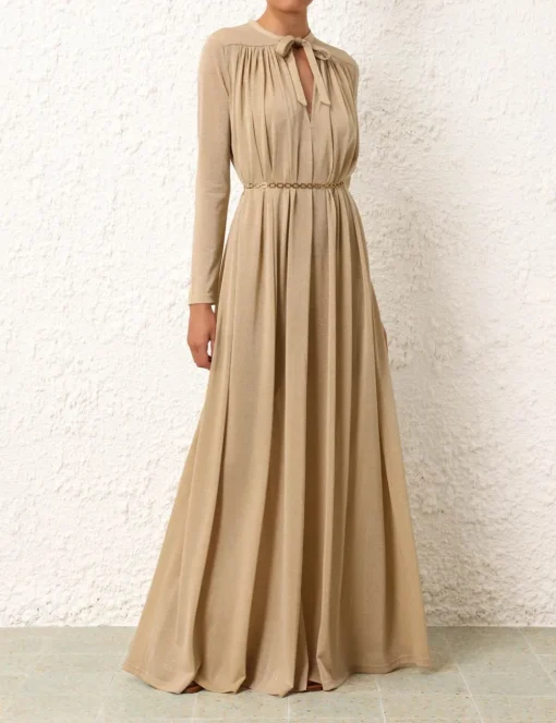 The Matchmaker Smock Dress In Gold From Our Resort 2024 Collection, Matchmaker. A Long Sleeved Maxi Dress Featuring A Deep V Neckline And Metallic Finish.- Lurex Maxi Dress