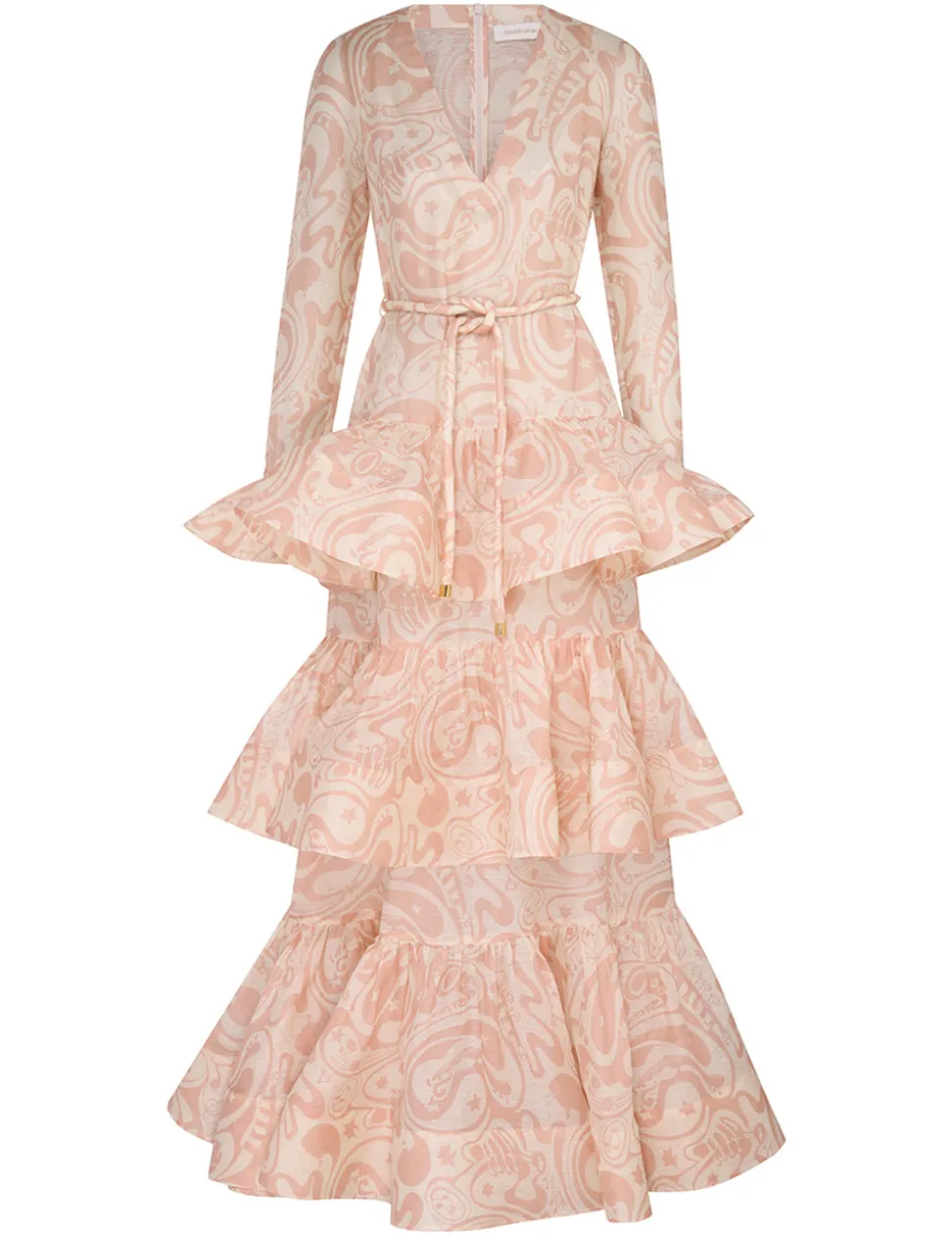 The Matchmaker V Neck Gown In Pink/Cream Abstract Musical From Our Resort 2024 Collection, Matchmaker. A Silk Linen Organza Gown Featuring A Deep V Neckline, A Layered Tiered Skirt And A Sleeve Ruffle.- Silk Linen Organza Gown