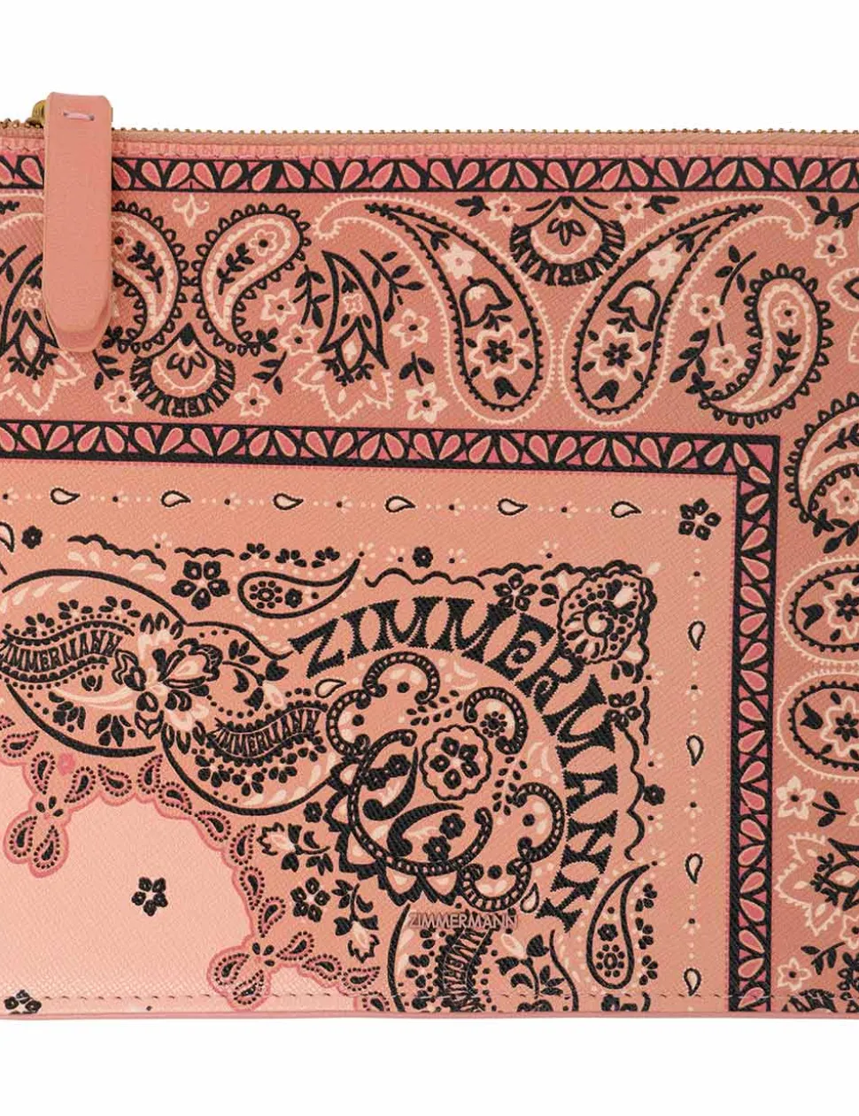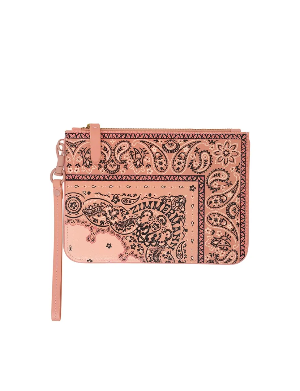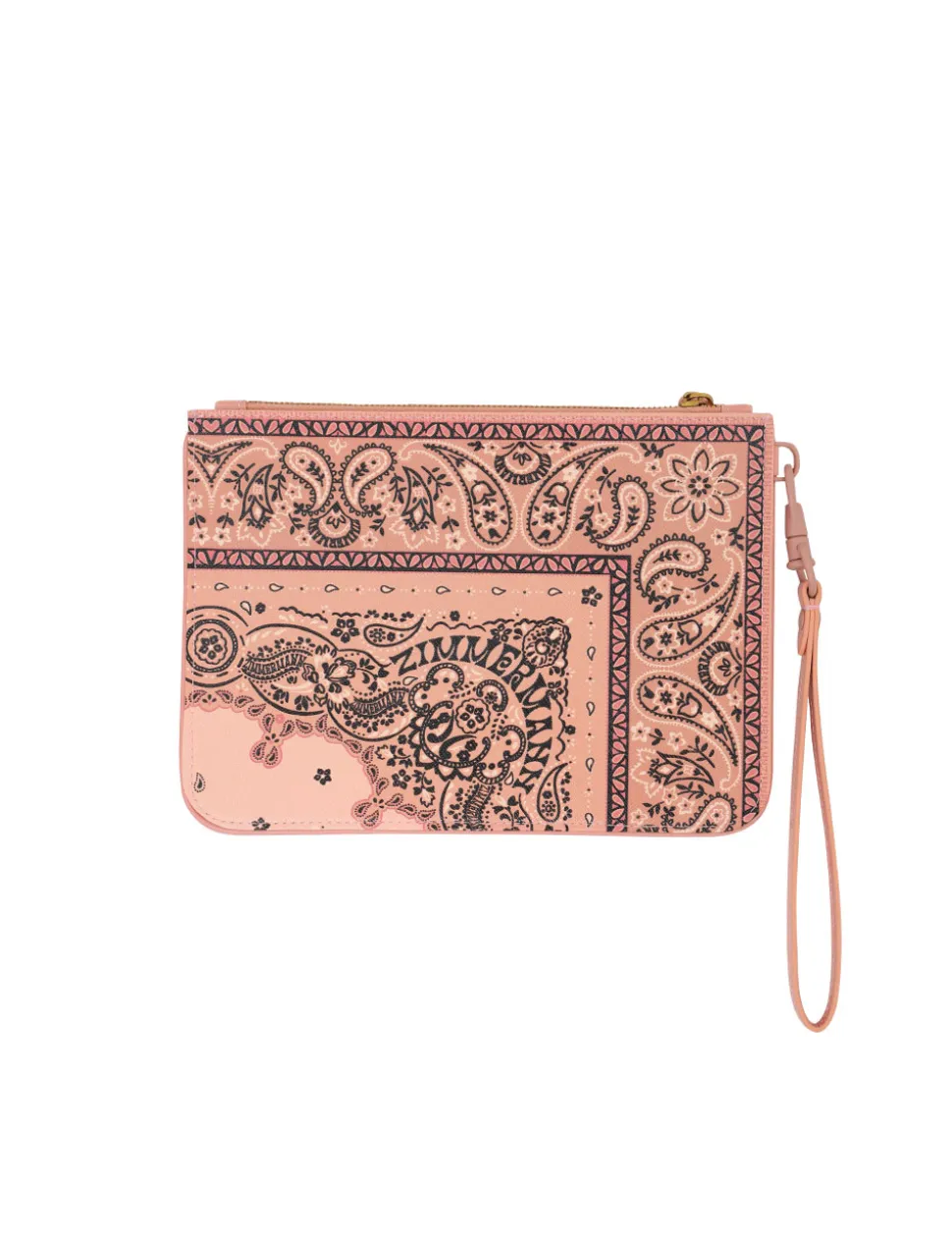 The Medium Printed Leather Pouch In Pink Bandana From Our Resort 2024 Collection. A Saffiano Leather Pouch With A Wrist Handle.- Leather Pouch