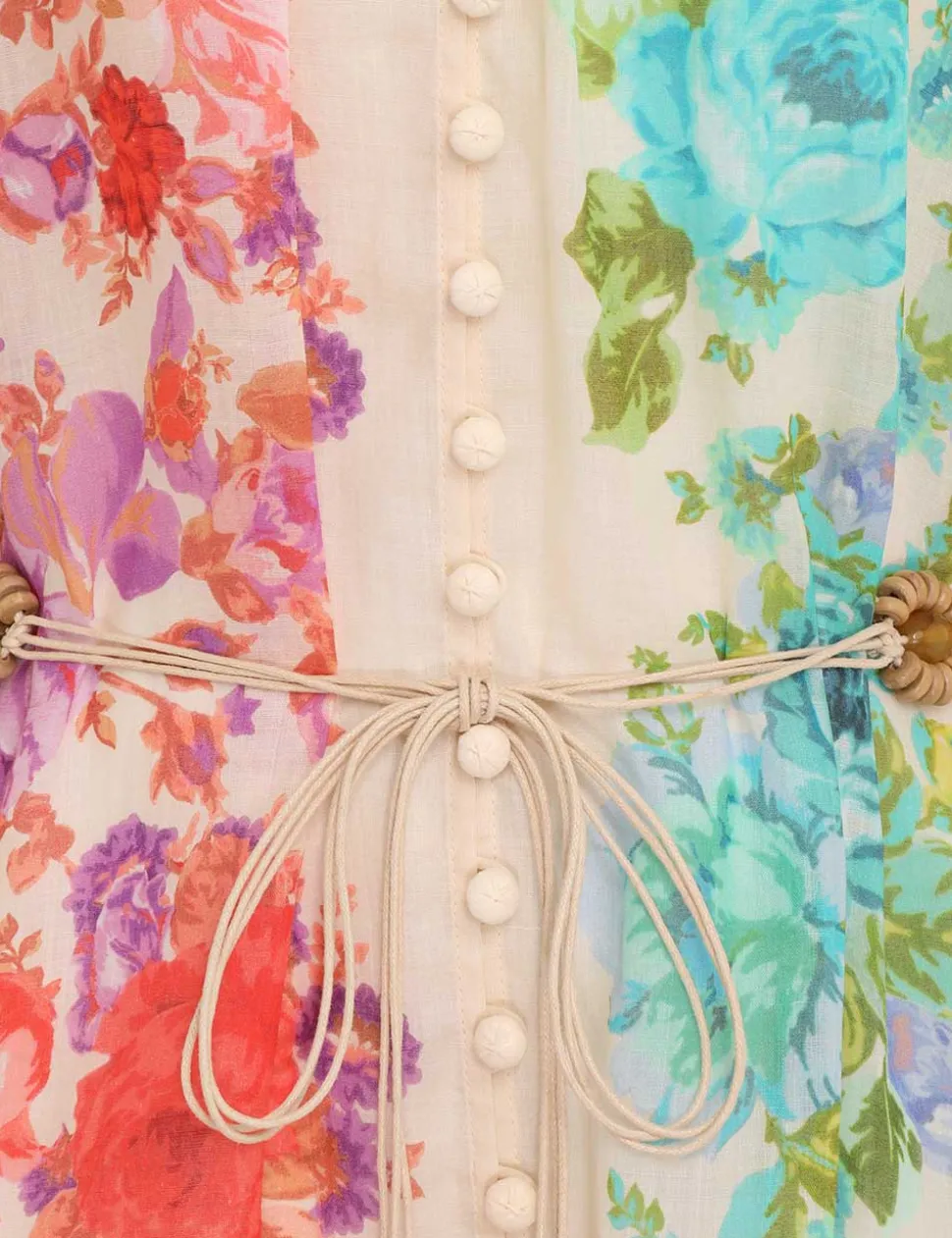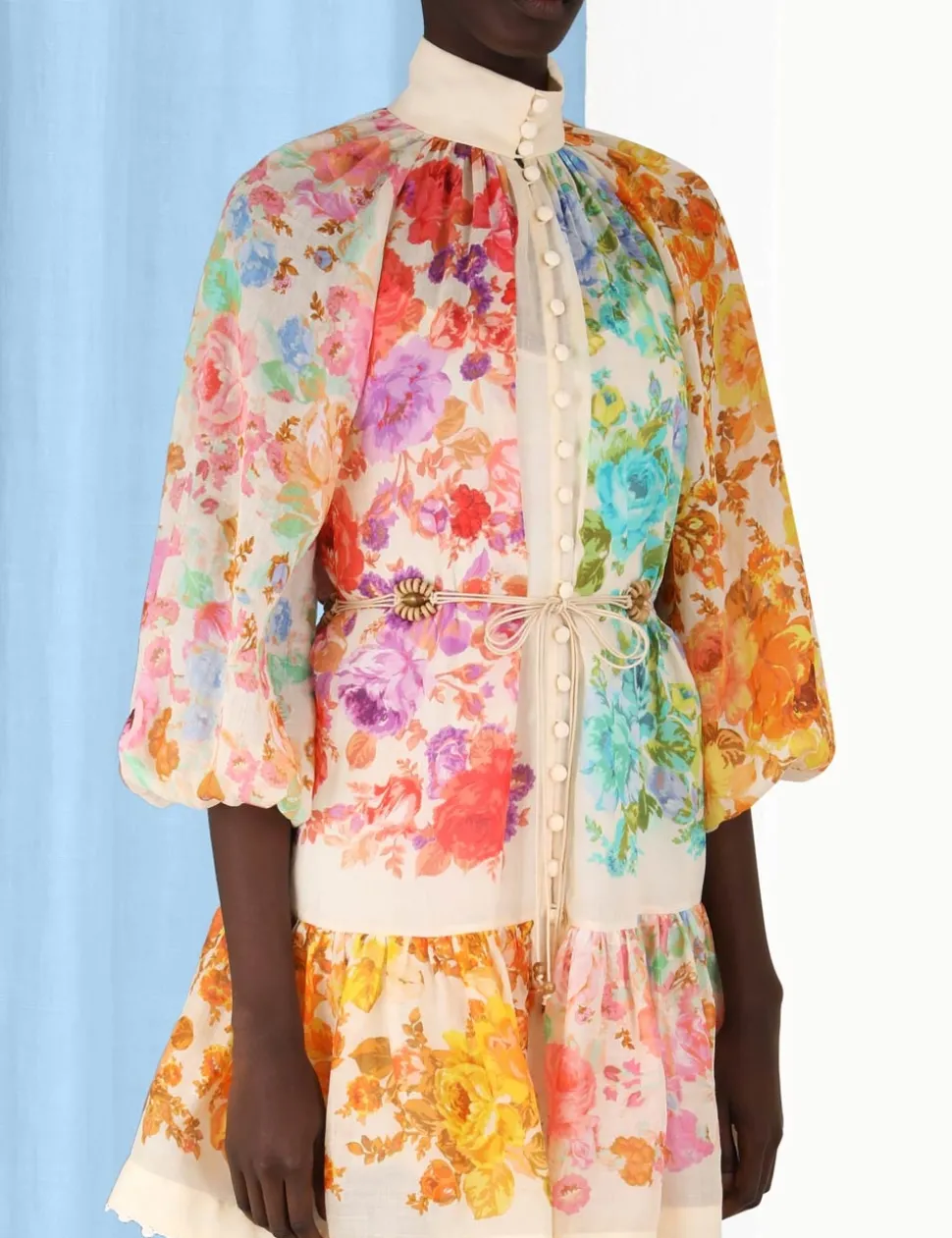 The Raie Lantern Mini Dress In Multi Floral From Our Summer Swim 2023 Collection. A Ramie Mini Dress Featuring Blouson Sleeves And A Drop Waist With Gathered Frill Skirt, Finished With A Beaded Rope Belt.- Ramie