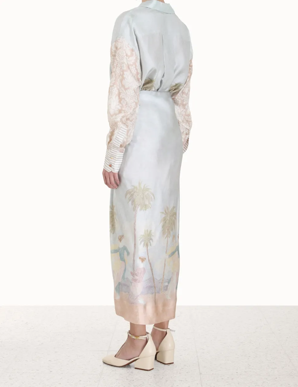 The Sensory Drape Midi Skirt In Dancer Print From Our Fall 2023 Collection, Luminosity. A Silk Midi Skirt Featuring A Draped Detail.- Silk Midi Skirt
