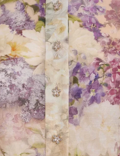 The Sensory Spliced Blouse In Multi Spliced Floral From Our Fall 2023 Collection, Luminosity. A Silk Linen Shirt Featuring A Classic Collar And Blouson Sleeves With Elongated Cuffs.- Silk Linen Shirt