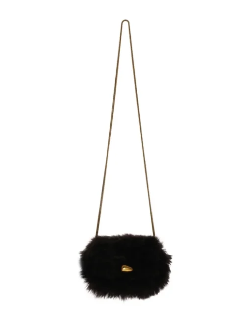 The Shearling Cross Body In Chocolate From Our Fall 2023 Collection, Luminosity. A Shearling Cross Body Bag Featuring Internal Card Pockets And A Gold Chain Strap, Finished With A Custom Branded Snap Closure.- Shearling Cross Body Bag