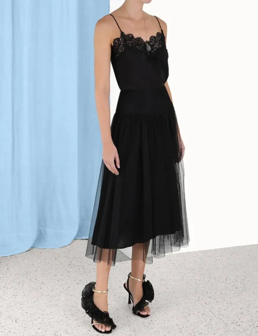 The Tulle Skirt In Black From Our Fall 2023 Collection, Luminosity. A Tulle Midi Skirt Featuring A Basque Waist And Raw Hem.- Midi Skirt