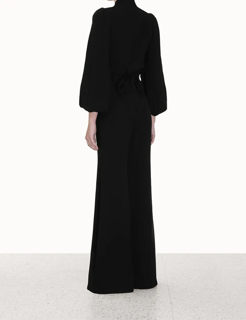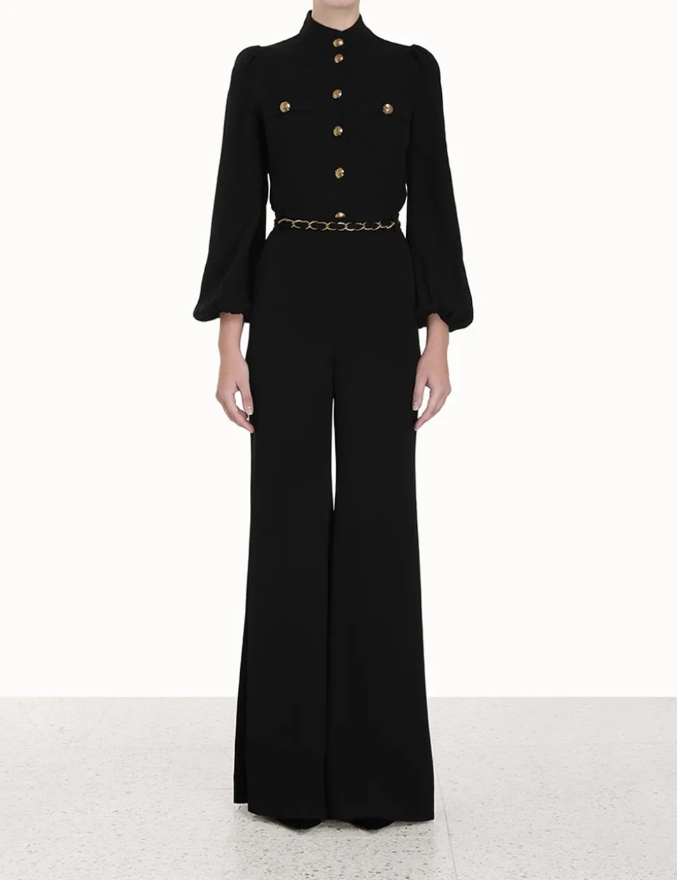 The Utility Body Shirt In Black From Our Fall 2023 Collection, Luminosity. A Long Sleeve Blouse Featuring A Mandarin Collar And Custom Gold Buttons Down The Centre Front.- Blouson Sleeves With Elastic Cuffs